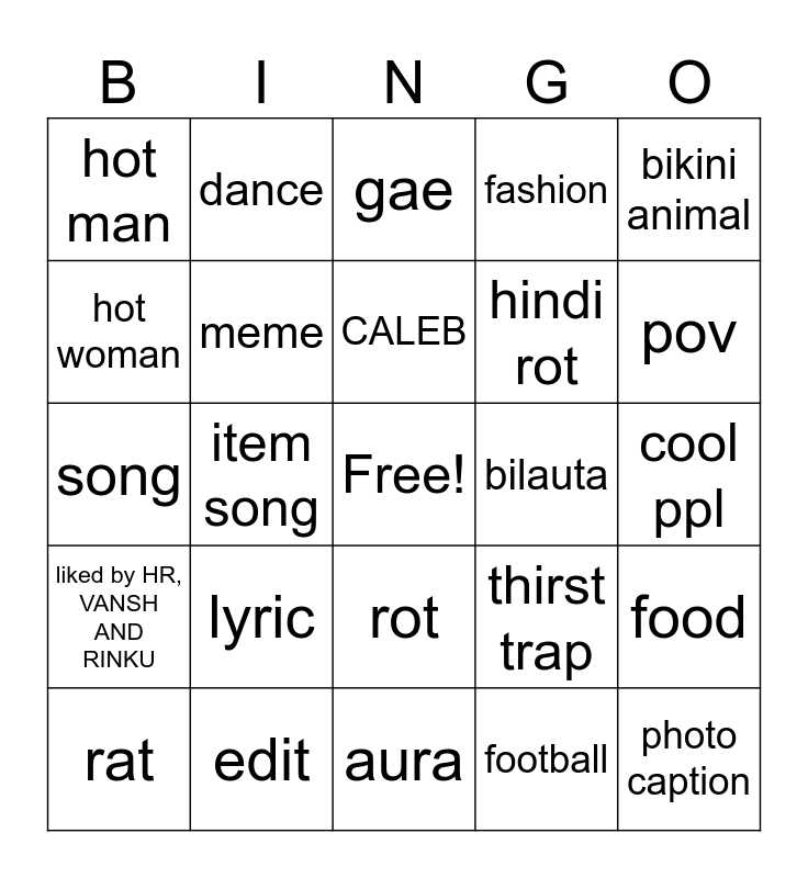 This bingo card has a free space and 24 words: lyric, edit, CALEB, rat, bikini animal, hot man, hot woman, dance, bilauta, rot, hindi rot, song, thirst trap, food, meme, football, cool ppl, gae, pov, item song, photo caption, liked by HR, VANSH AND RINKU, fashion and aura.