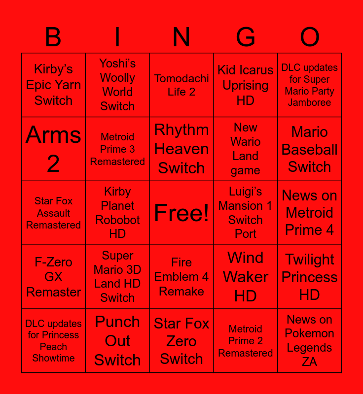 This bingo card has a free space and 24 words: Super Mario 3D Land HD Switch, Punch Out Switch, Rhythm Heaven Switch, DLC updates for Princess Peach Showtime, DLC updates for Super Mario Party Jamboree, Kirby’s Epic Yarn Switch, Arms 2, Yoshi’s Woolly World Switch, Luigi’s Mansion 1 Switch Port, Fire Emblem 4 Remake, New Wario Land game, Star Fox Assault Remastered, Wind Waker HD, Twilight Princess HD, Metroid Prime 3 Remastered, Metroid Prime 2 Remastered, News on Metroid Prime 4, Tomodachi Life 2, Mario Baseball Switch, Kirby Planet Robobot HD, News on Pokemon Legends ZA, F-Zero GX Remaster, Kid Icarus Uprising HD and Star Fox Zero Switch.