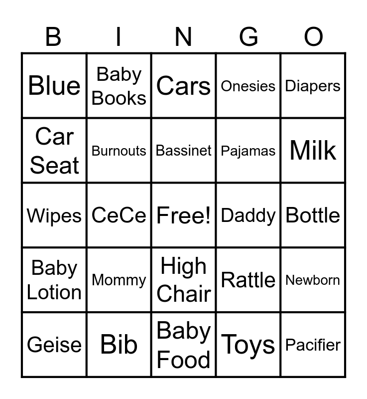 This bingo card has a free space and 29 words: Geise, Holden, CeCe, Baby Boy, Blue, Cars, Burnouts, Mommy, Daddy, Bib, Bottle, Pacifier, Baby Food, Toys, Milk, Blanket, High Chair, Baby Lotion, Diapers, Wipes, Rattle, Stroller, Pajamas, Car Seat, Onesies, Baby Books, Newborn, Bassinet and Love.