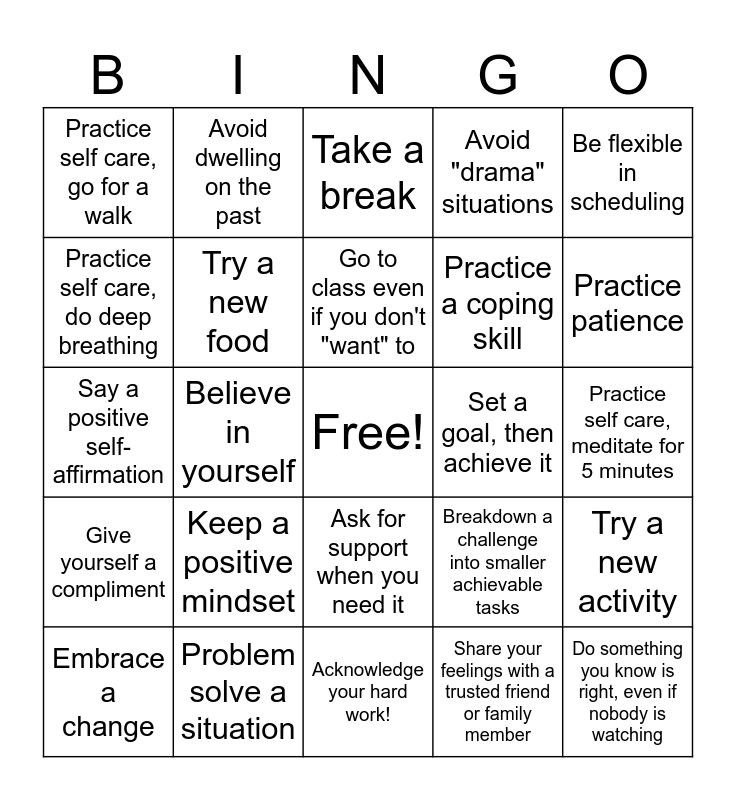 This bingo card has a free space and 24 words: Keep a positive mindset, Problem solve a situation, Go to class even if you don't "want" to, Embrace a change, Be flexible in scheduling, Practice self care, go for a walk, Practice self care, do deep breathing, Avoid dwelling on the past, Set a goal, then achieve it, Ask for support when you need it, Practice a coping skill, Say a positive self-affirmation, Breakdown a challenge into smaller achievable tasks, Try a new activity, Try a new food, Share your feelings with a trusted friend or family member, Practice self care, meditate for 5 minutes, Take a break, Practice patience, Believe in yourself, Do something you know is right, even if nobody is watching, Give yourself a compliment, Avoid "drama" situations and Acknowledge your hard work!.