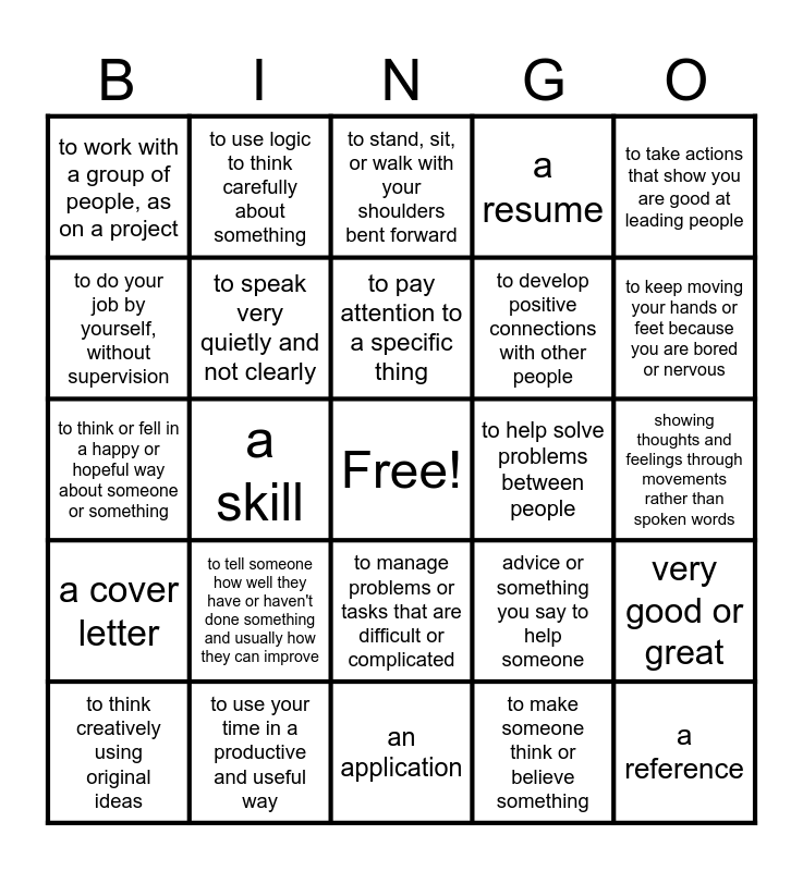 This bingo card has a free space and 24 words: to tell someone how well they have or haven't done something and usually how they can improve, to use your time in a productive and useful way, to pay attention to a specific thing, to think creatively using original ideas, to take actions that show you are good at leading people, to work with a group of people, as on a project, to do your job by yourself, without supervision, to use logic to think carefully about something, to help solve problems between people, to manage problems or tasks that are difficult or complicated, to develop positive connections with other people, to think or fell in a happy or hopeful way about someone or something, advice or something you say to help someone, very good or great, to speak very quietly and not clearly, to make someone think or believe something, showing thoughts and feelings through movements rather than spoken words, to stand, sit, or walk with your shoulders bent forward, to keep moving your hands or feet because you are bored or nervous, a skill, a reference, a cover letter, a resume and an application.