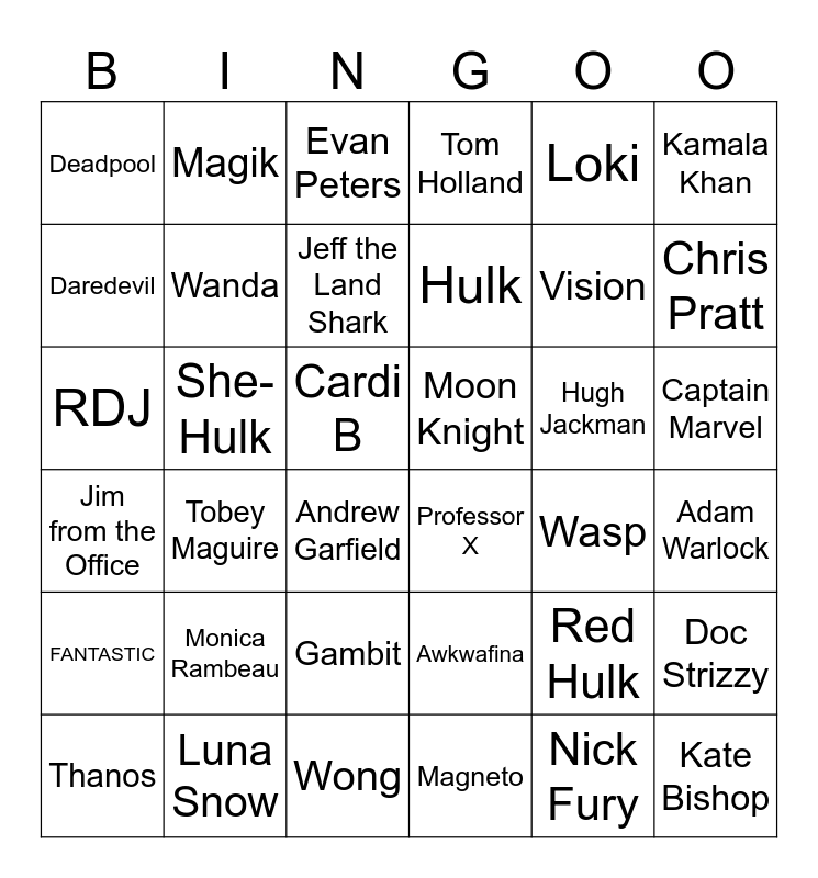 This bingo card has 36 words: Awkwafina, Gambit, Magneto, Daredevil, Jim from the Office, Moon Knight, Wanda, Wong, Loki, Red Hulk, Chris Pratt, Tom Holland, Doc Strizzy, She-Hulk, Hulk, Deadpool, FANTASTIC, Hugh Jackman, RDJ, Evan Peters, Cardi B, Tobey Maguire, Professor X, Andrew Garfield, Wasp, Magik, Vision, Luna Snow, Jeff the Land Shark, Kamala Khan, Kate Bishop, Thanos, Adam Warlock, Captain Marvel, Monica Rambeau and Nick Fury.