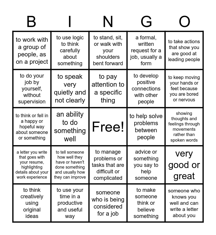 This bingo card has a free space and 24 words: to tell someone how well they have or haven't done something and usually how they can improve, to use your time in a productive and useful way, to pay attention to a specific thing, to think creatively using original ideas, to take actions that show you are good at leading people, to work with a group of people, as on a project, to do your job by yourself, without supervision, to use logic to think carefully about something, to help solve problems between people, to manage problems or tasks that are difficult or complicated, to develop positive connections with other people, to think or fell in a happy or hopeful way about someone or something, advice or something you say to help someone, very good or great, to speak very quietly and not clearly, to make someone think or believe something, showing thoughts and feelings through movements rather than spoken words, to stand, sit, or walk with your shoulders bent forward, to keep moving your hands or feet because you are bored or nervous, an ability to do something well, someone who knows you well and can write a letter about you, a letter you write that goes with your resume, highlighting details about your work experience, a formal, written request for a job, usually a form and someone who is being considered for a job.