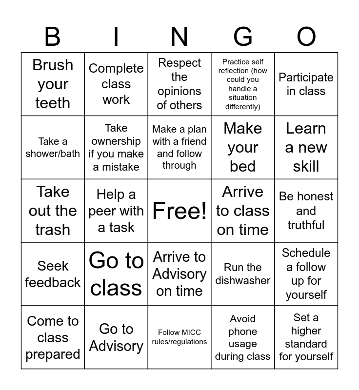 This bingo card has a free space and 24 words: Go to class, Go to Advisory, Make a plan with a friend and follow through, Come to class prepared, Participate in class, Brush your teeth, Take a shower/bath, Complete class work, Arrive to class on time, Arrive to Advisory on time, Make your bed, Take out the trash, Run the dishwasher, Schedule a follow up for yourself, Take ownership if you make a mistake, Avoid phone usage during class, Be honest and truthful, Respect the opinions of others, Learn a new skill, Help a peer with a task, Set a higher standard for yourself, Seek feedback, Practice self reflection (how could you handle a situation differently) and Follow MICC rules/regulations.