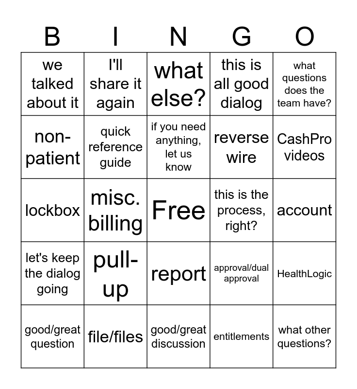 This bingo card has a free space and 34 words: from a bank perspective, we are ready, entitlements, this is all good, CashPro experts, let's keep the dialog going, quick reference guide, what questions does the team have?, good/great question, I'll share it again, alerts, if you need anything, let us know, what else?, just to frame up our discussion, alright, so, this is the process, right?, CashPro videos, file/files, lockbox, pull-up, approval/dual approval, report, what does everyone want to talk through?, we talked about it, account, good/great discussion, what other questions?, this is all good dialog, desktop deposit, reverse wire, non-patient, cash vault, misc. billing, HealthLogic and cash.