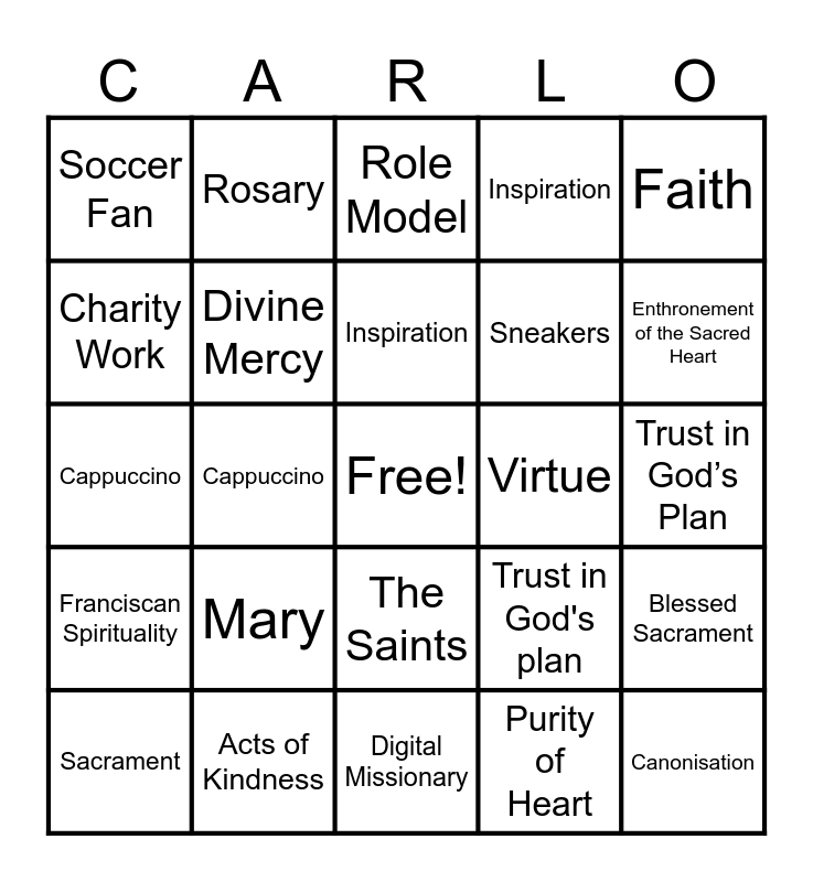 This bingo card has a free space and 52 words: Role Model, Canonisation, Italy, Digital Missionary, Mary, Millenial Saint, Rosary, Love for Saints, Charity Work, Science, Divine Mercy, Spaghetti, Blessed Sacrament, Trust in God's plan, Fatima, Acts of Kindness, Inspiration, Virtue, Franciscan Spirituality, Faith, Cappuccino, Purity of Heart, Soccer Fan, Sneakers, Spaghetti, Rosary, Blessed Sacrament, Charity Work, Enthronement of the Sacred Heart, Pilgrimage to Lourdes, Virtue, Inspiration, Faith, Science, Purity of Heart, Role Model, Acts of Kindness, Digital, Missionary, Praying the, Divine Mercy, Trust in God’s Plan, Franciscan Spirituality, Love for, The Saints, Pilgrimage to Fatima, Canonisation, Cappuccino, Soccer Fan, Blessed, Sacrament and Sneakers.