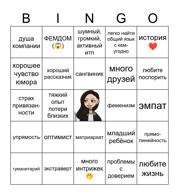 This bingo card has a free space and 24 words: оптимист, экстраверт, сангвиник, гуманитарий, история ❤️, душа компании, хорошее чувство юмора, ФЕМДОМ (😱), феменизм, матриархат, много друзей, страх привязан- ности, младший ребёнок, прямо- линейность, хороший рассказчик, проблемы с доверием, эмпат, шумный, громкий, активный итп, любите поспорить, тяжкий опыт потери близких, любите жизнь, упрямость, легко найти общий язык с кем-угодно and много интрижек 🤭.