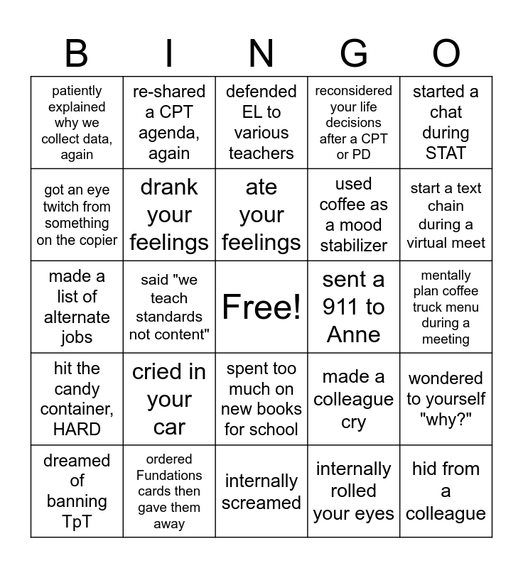 This bingo card has a free space and 24 words: cried in your car, ordered Fundations cards then gave them away, ate your feelings, dreamed of banning TpT, started a chat during STAT, patiently explained why we collect data, again, got an eye twitch from something on the copier, re-shared a CPT agenda, again, sent a 911 to Anne, spent too much on new books for school, used coffee as a mood stabilizer, made a list of alternate jobs, made a colleague cry, wondered to yourself "why?", drank your feelings, internally rolled your eyes, mentally plan coffee truck menu during a meeting, defended EL to various teachers, start a text chain during a virtual meet, said "we teach standards not content", hid from a colleague, hit the candy container, HARD, reconsidered your life decisions after a CPT or PD and internally screamed.