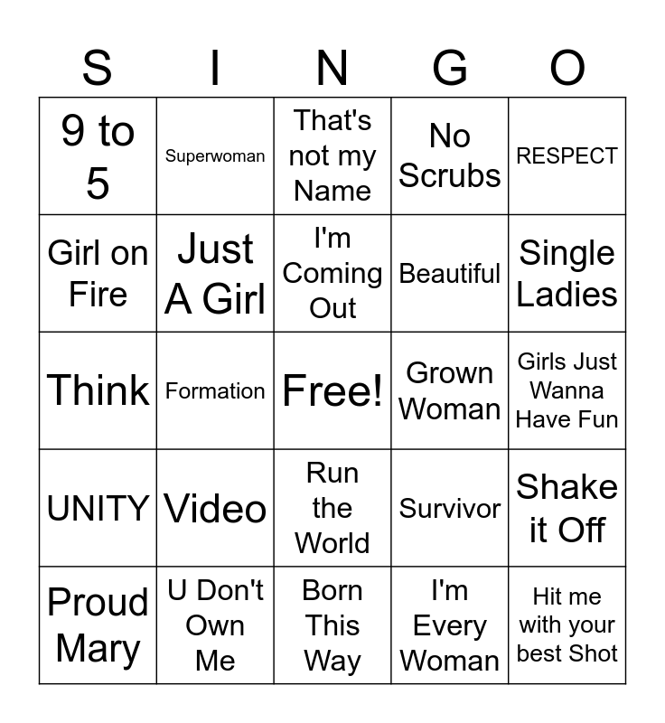 This bingo card has a free space and 26 words: Run the World, I'm Every Woman, I'm Coming Out, U Don't Own Me, RESPECT, 9 to 5, Girl on Fire, Superwoman, Girls Just Wanna Have Fun, Survivor, Beautiful, Think, Shake it Off, Proud Mary, Formation, All about the Bass, No Scrubs, UNITY, That's not my Name, Hit me with your best Shot, Single Ladies, Born This Way, Grown Woman, Video, Just A Girl and None of Your Business.