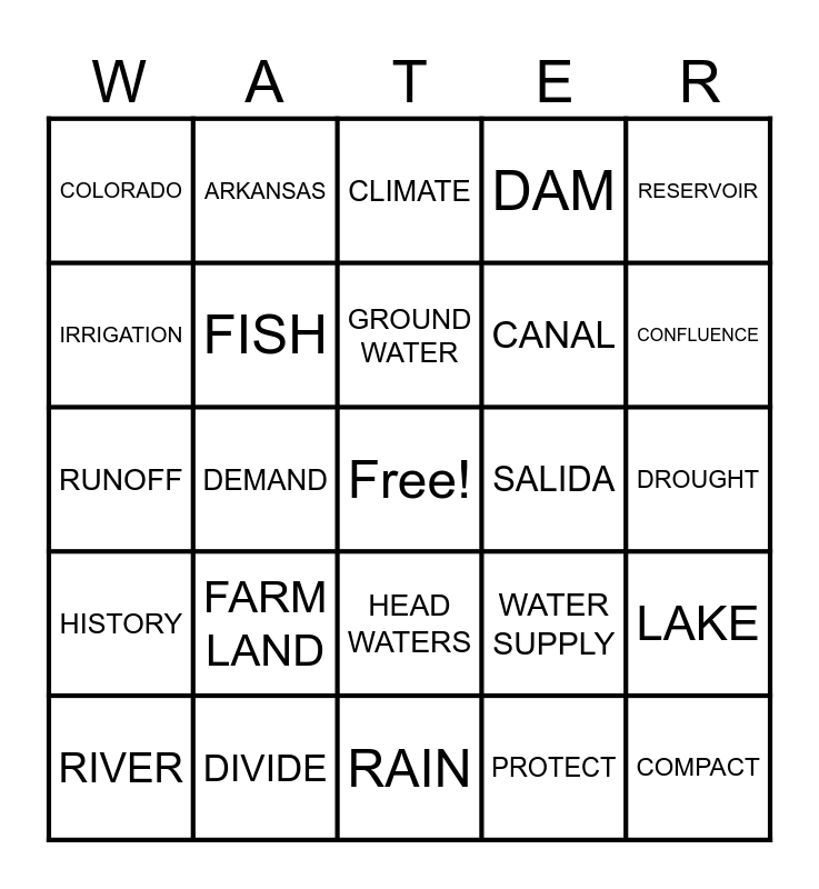 This bingo card has a free space and 25 words: FARM LAND, RAIN, GROUND WATER, RIVER, RESERVOIR, COLORADO, IRRIGATION, ARKANSAS, SALIDA, HEAD WATERS, CANAL, RUNOFF, WATER SUPPLY, LAKE, FISH, STREAM, DROUGHT, CLIMATE, CONFLUENCE, DEMAND, COMPACT, DIVIDE, HISTORY, DAM and PROTECT.