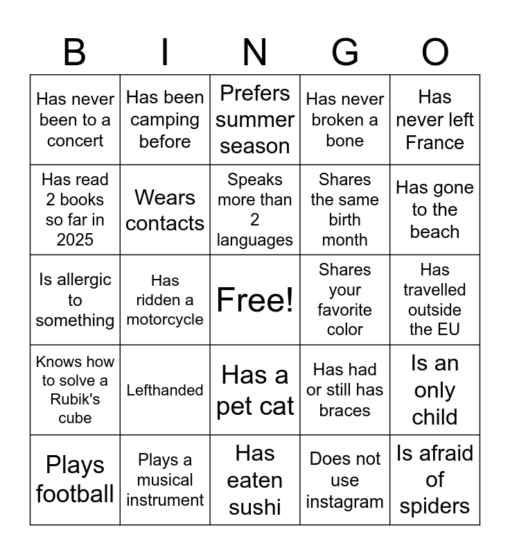 This bingo card has a free space and 24 words: Lefthanded, Plays a musical instrument, Speaks more than 2 languages, Plays football, Has never left France, Has never been to a concert, Has read 2 books so far in 2025, Has been camping before, Shares your favorite color, Has a pet cat, Shares the same birth month, Is allergic to something, Has had or still has braces, Is an only child, Wears contacts, Does not use instagram, Has travelled outside the EU, Prefers summer season, Has gone to the beach, Has ridden a motorcycle, Is afraid of spiders, Knows how to solve a Rubik's cube, Has never broken a bone and Has eaten sushi.