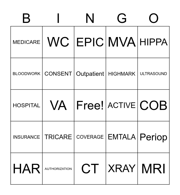 This bingo card has a free space and 29 words: HAR, DOCTOR, VA, MEDICAID, MEDICARE, EPIC, CONSENT, TRICARE, ACTIVE, AUTHORIZATION, COB, MRI, CT, XRAY, ULTRASOUND, EMERGENCY ROOM, COVERAGE, INSURANCE, HIPPA, HOSPITAL, EMTALA, IMM, HIGHMARK, BLOODWORK, MVA, WC, Periop, Outpatient and Inpatient.
