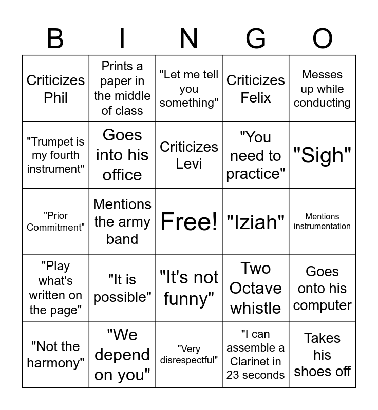 This bingo card has a free space and 29 words: "I own 13 trombones", "We depend on you", "Let me tell you something", Criticizes Matthew, Messes up while conducting, Criticizes Phil, Goes into his office, Criticizes Levi, "Iziah", Goes onto his computer, "Not the harmony", Mentions the army band, "I can assemble a Clarinet in 23 seconds, Takes his shoes off, "Prior Commitment", "Check this out", "Very disrespectful", Two Octave whistle, "Sigh", "Play what's written on the page", "It is possible", Finger Wag, "You need to practice", Mentions instrumentation, "Trumpet is my fourth instrument", Prints a paper in the middle of class, "It's not funny", Criticizes Felix and Ends rehearsal early.