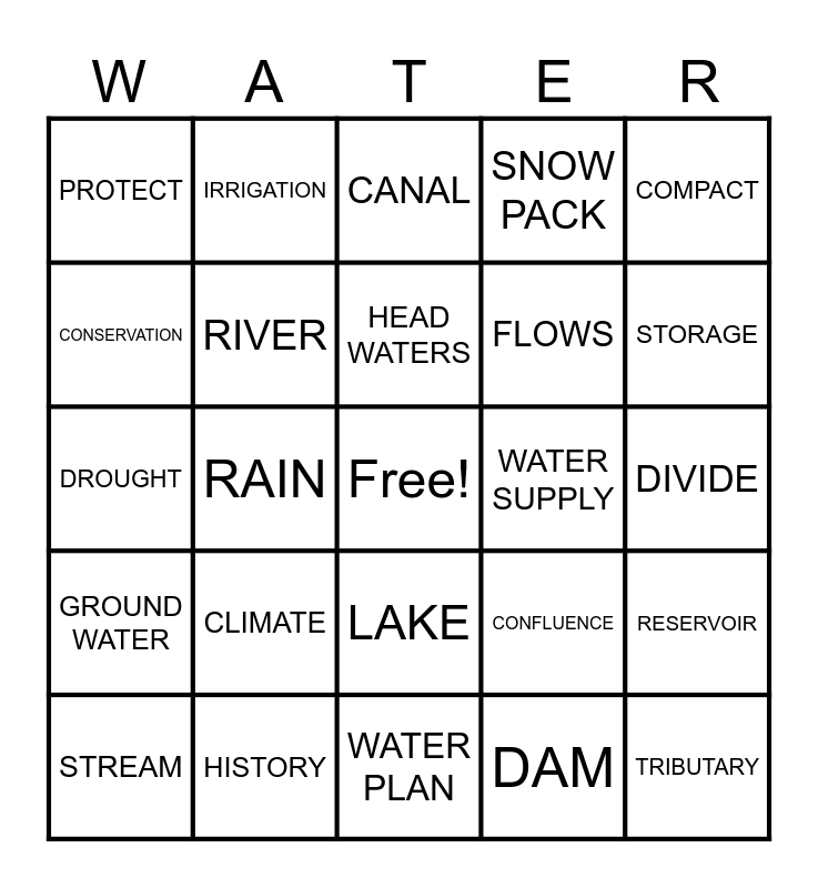 This bingo card has a free space and 32 words: DAM, FARM LAND, RAIN, COLORADO, GROUND WATER, RIVER, COMPACT, RESERVOIR, IRRIGATION, ARKANSAS, HEAD WATERS, CANAL, RUNOFF, SALIDA, WATER SUPPLY, FISH, STREAM, DROUGHT, LAKE, CLIMATE, CONFLUENCE, DEMAND, DIVIDE, HISTORY, TRIBUTARY, SNOW PACK, FLOWS, CONSERVATION, PROTECT, WATER PLAN, RANCHES and STORAGE.