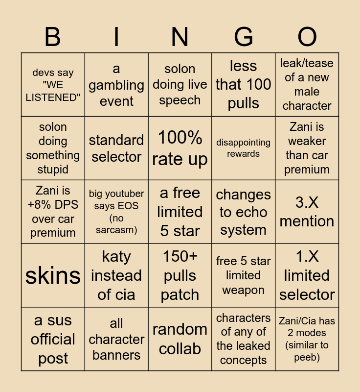This bingo card has a free space and 24 words: katy instead of cia, all character banners, 100% rate up, a sus official post, leak/tease of a new male character, devs say "WE LISTENED", solon doing something stupid, a gambling event, changes to echo system, 150+ pulls patch, disappointing rewards, Zani is +8% DPS over car premium, free 5 star limited weapon, 1.X limited selector, standard selector, characters of any of the leaked concepts, 3.X mention, solon doing live speech, Zani is weaker than car premium, big youtuber says EOS (no sarcasm), Zani/Cia has 2 modes (similar to peeb), skins, less that 100 pulls and random collab.