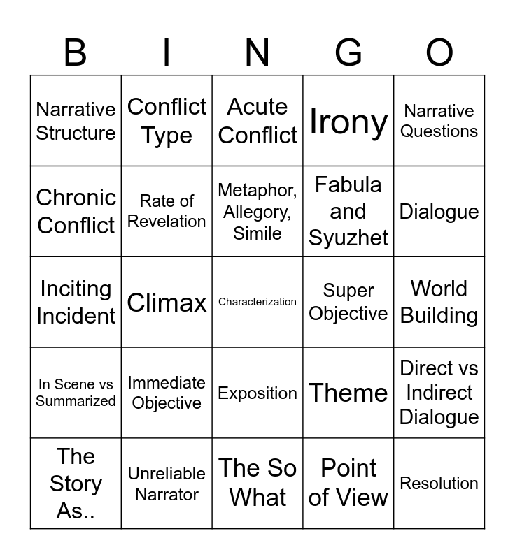 This bingo card has 25 words: Immediate Objective, The So What, Metaphor, Allegory, Simile, The Story As.., Narrative Questions, Narrative Structure, Chronic Conflict, Conflict Type, Super Objective, Exposition, Fabula and Syuzhet, Inciting Incident, Theme, Direct vs Indirect Dialogue, Rate of Revelation, Resolution, World Building, Acute Conflict, Dialogue, Climax, Characterization, Unreliable Narrator, In Scene vs Summarized, Irony and Point of View.