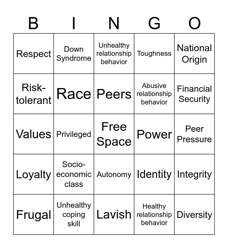 This bingo card has a free space and 29 words: Frugal, Spirituality, Privileged, Ethnicity, Respect, Unhealthy relationship behavior, Race, Socio-economic class, Power, Unhealthy coping skill, Peer Pressure, Diversity, Lavish, Healthy relationship behavior, Financial Security, Coping Skills, Autonomy, Loyalty, National Origin, Values, Identity, Healthy coping skill, Abusive relationship behavior, Risk-tolerant, Toughness, Down Syndrome, Integrity, Peers and Autism.