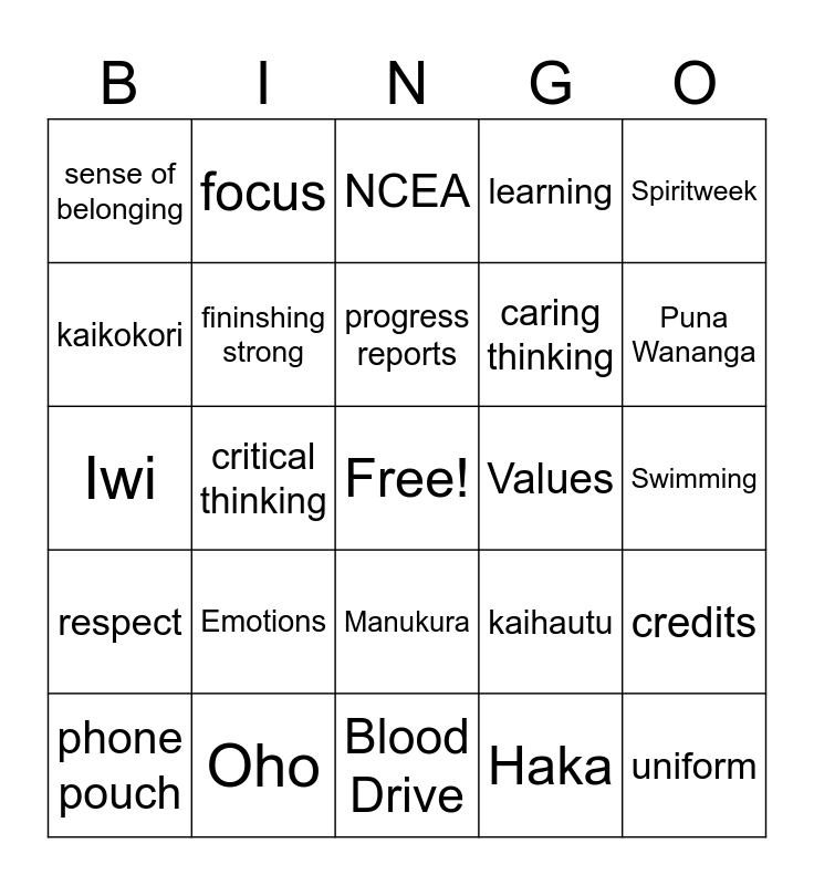 This bingo card has a free space and 29 words: phone pouch, assessments, critical thinking, community, sense of belonging, NCEA, fininshing strong, Emotions, Values, Oho, Swimming, uniform, Blood Drive, Haka, Puna Wananga, wandering, Manukura, respect, Spiritweek, Iwi, kaihautu, Katie, caring thinking, kaikokori, learning, focus, credits, progress reports and whanau.