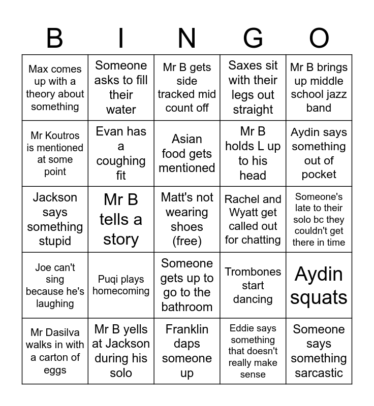 This bingo card has a free space and 29 words: Mr Dasilva walks in with a carton of eggs, AJ has to take his hat off, Mr B tells a story, Eddie can't stop laughing, Max comes up with a theory about something, Mr B gets side tracked mid count off, Evan has a coughing fit, Puqi plays homecoming, Rachel and Wyatt get called out for chatting, Mr B yells at Jackson during his solo, Someone's late to their solo bc they couldn't get there in time, Someone says something sarcastic, Franklin daps someone up, Eddie says something that doesn't really make sense, Aydin says something out of pocket, Mr B screams, Someone gets up to go to the bathroom, Joe can't sing because he's laughing, Mr B brings up middle school jazz band, Jackson says something stupid, Trombones start dancing, Trumpets are aggressively nodding their heads in sync, Mr B holds L up to his head, Mr Koutros is mentioned at some point, Saxes sit with their legs out straight, Someone asks to fill their water, Aydin squats, Asian food gets mentioned and Someone has a drink that's not water.