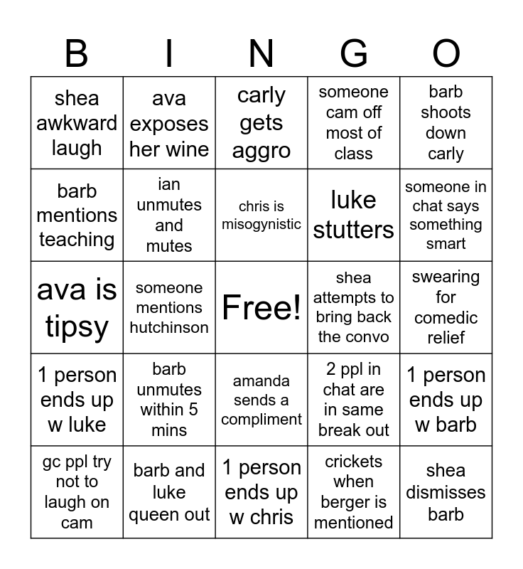 This bingo card has a free space and 24 words: barb unmutes within 5 mins, barb and luke queen out, chris is misogynistic, gc ppl try not to laugh on cam, barb shoots down carly, shea awkward laugh, barb mentions teaching, ava exposes her wine, shea attempts to bring back the convo, amanda sends a compliment, luke stutters, ava is tipsy, 2 ppl in chat are in same break out, 1 person ends up w barb, ian unmutes and mutes, crickets when berger is mentioned, swearing for comedic relief, carly gets aggro, someone in chat says something smart, someone mentions hutchinson, shea dismisses barb, 1 person ends up w luke, someone cam off most of class and 1 person ends up w chris.