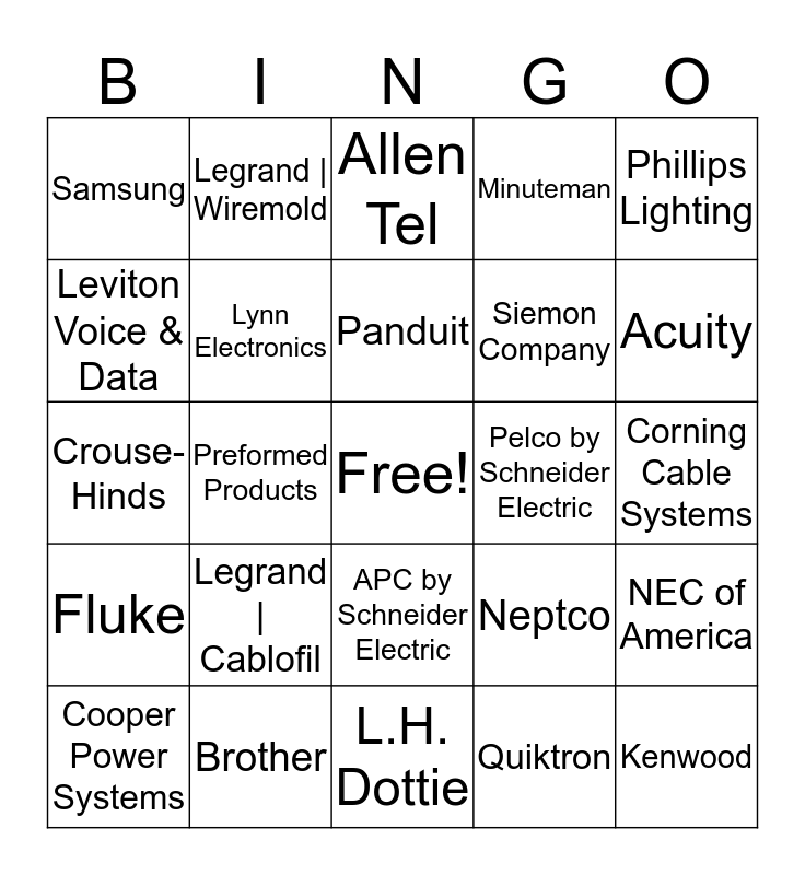This bingo card has a free space and 50 words: Ideal, Kenwood, Klein Tools, L.H. Dottie, Legrand | Cablofil, Legrand | Ortronics, Legrand | Wiremold, Leviton, Leviton Voice & Data, Lutron, Lynn Electronics, Minuteman, NEC of America, Neptco, OFS, Oberon, Panduit, Pelco by Schneider Electric, Phoenix Contact, Phillips Lighting, Preformed Products, Quiktron, Samsung, Siemon Company, 3M Electrical, 3M Telecom, Acuity, AFL Telecom, Allen Tel, APC by Schneider Electric, Arlington, Belden/Mohawk, Berk-Tek, Brady, Brother, BURNDY, Cerro, Chatsworth, Commscope, Corning Cable Systems, Eaton’s Businesses, B-line, Bussmann, Cooper Lighting, Cooper Power Systems, Crouse-Hinds, Erico, FCI, Fluke and Fluke Networks.