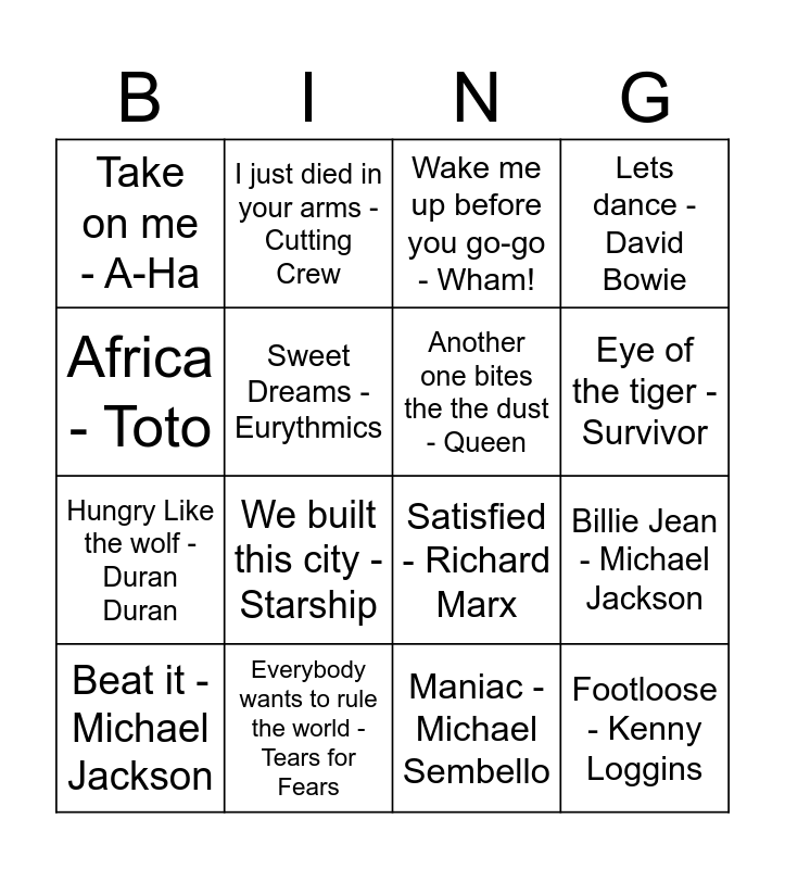 This bingo card has 37 words: Crazy Little thing called love - Queen, Funkytown - Lipps, 9 to 5 - Dolly Parton, Another one bites the the dust - Queen, Jessie's Girl - Rick Springfield, I love rock and roll - Joan Jett, Eye of the tiger - Survivor, Who can it be now - Men at work, Africa - Toto, Maneater - Hall and Oats, Billie Jean - Michael Jackson, Lets dance - David Bowie, Beat it - Michael Jackson, Maniac - Michael Sembello, Sweet Dreams - Eurythmics, Footloose - Kenny Loggins, Whats love got to do with it - Tina Turner, Wake me up before you go-go - Wham!, Out of touch - Hall and Oats, Everybody wants to rule the world - Tears for Fears, Take on me - A-Ha, We built this city - Starship, Addicted to Love - Robert Palmer, Rock me Amadeus - Falco, You give love a bad name - Bon Jovi, Livin on a Prayer - Bon Jovi, I just died in your arms - Cutting Crew, I wanna dance with somebody - Whitney Houston, Never gonna give you up - Rick Astley, Man in the Mirror - Michael Jackson, Love bites - Def Leppard, We didn't start the fire - Billy Joel, Satisfied - Richard Marx, Don’t stop believing - Journey, Video killed the radio star - The Buggles, Hungry Like the wolf - Duran Duran and Mickey - Tony Basil.