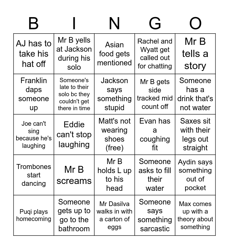 This bingo card has a free space and 29 words: Puqi plays homecoming, Eddie says something that doesn't really make sense, Eddie can't stop laughing, Aydin squats, AJ has to take his hat off, Asian food gets mentioned, Someone's late to their solo bc they couldn't get there in time, Mr B screams, Evan has a coughing fit, Someone gets up to go to the bathroom, Saxes sit with their legs out straight, Max comes up with a theory about something, Mr Dasilva walks in with a carton of eggs, Someone says something sarcastic, Someone has a drink that's not water, Mr Koutros is mentioned at some point, Mr B holds L up to his head, Trombones start dancing, Mr B tells a story, Joe can't sing because he's laughing, Someone asks to fill their water, Mr B brings up middle school jazz band, Mr B gets side tracked mid count off, Franklin daps someone up, Rachel and Wyatt get called out for chatting, Mr B yells at Jackson during his solo, Aydin says something out of pocket, Jackson says something stupid and Trumpets are aggressively nodding their heads in sync.