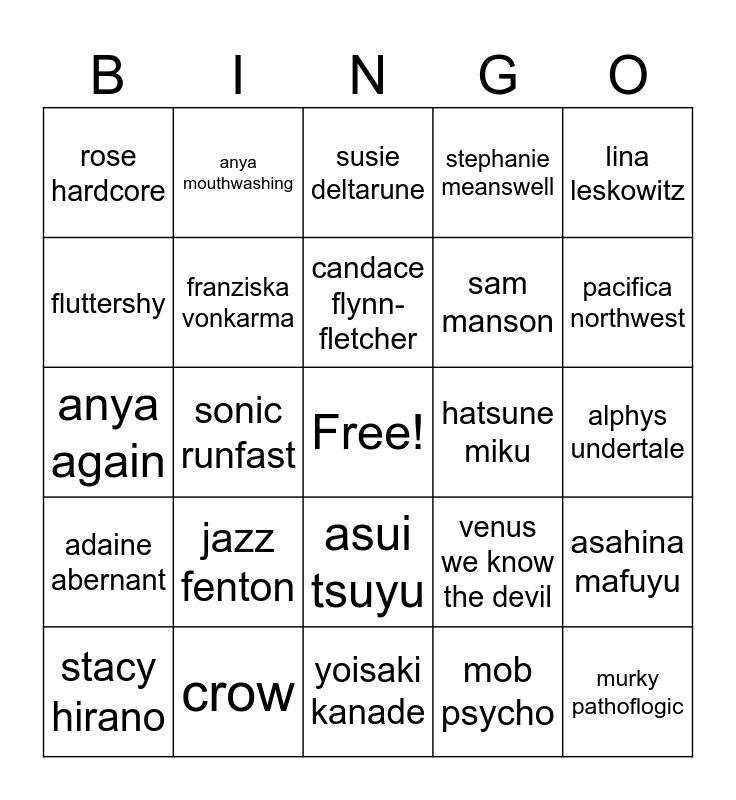This bingo card has a free space and 24 words: jazz fenton, crow, candace flynn-fletcher, stacy hirano, lina leskowitz, rose hardcore, fluttershy, anya mouthwashing, hatsune miku, asui tsuyu, sam manson, anya again, venus we know the devil, asahina mafuyu, franziska vonkarma, mob psycho, alphys undertale, susie deltarune, pacifica northwest, sonic runfast, murky pathoflogic, adaine abernant, stephanie meanswell and yoisaki kanade.