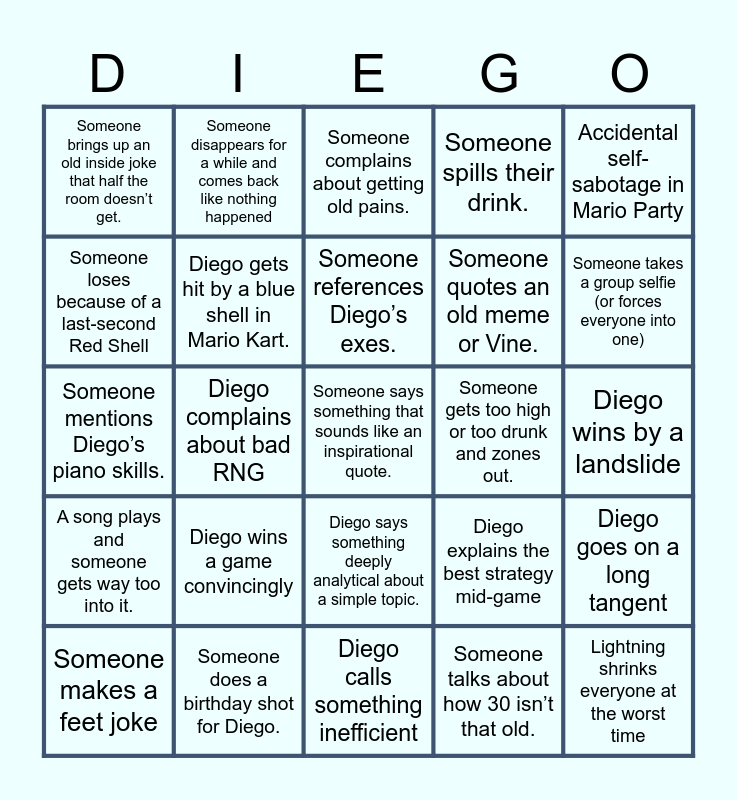 This bingo card has 40 words: Diego corrects someone., Someone mentions Diego’s piano skills., A conversation starts with, "Back in our 20s...", Diego gets hit by a blue shell in Mario Kart., Someone does a birthday shot for Diego., Diego says something deeply analytical about a simple topic., Someone references Diego’s exes., A conversation turns into overanalyzing a childhood memory., Accidental self-sabotage in Mario Party, A song plays and someone gets way too into it., Diego complains about bad RNG, Someone spills their drink., Someone says something that sounds like an inspirational quote., Diego wins by a landslide, Someone gets too high or too drunk and zones out., Diego wins a game convincingly, Someone sings off-key during the birthday song., Someone brings up an old inside joke that half the room doesn’t get., Someone gets triple Red Shells and turns evil, Someone complains about getting old pains., Diego goes on a long tangent, Someone talks about how 30 isn’t that old., Someone quotes an old meme or Vine., Someone loses because of a last-second Red Shell, Someone makes a bad decision and everyone calls them out for it., Someone mentions Diego’s insane piano skills, A deep conversation about life happens., Someone references high school (Everglades High)., Lightning shrinks everyone at the worst time, Someone says, "I shouldn't drink anymore" but keeps drinking., Diego talks about work, Someone makes a feet joke, A debate about music theory happens (bonus if Diego is involved), Diego explains the best strategy mid-game, Someone takes a group selfie (or forces everyone into one), Diego calls something inefficient, Someone brings up one of Diego’s exes, Someone tries to make a toast but gets interrupted, Someone disappears for a while and comes back like nothing happened and Someone flirts (successfully or awkwardly).