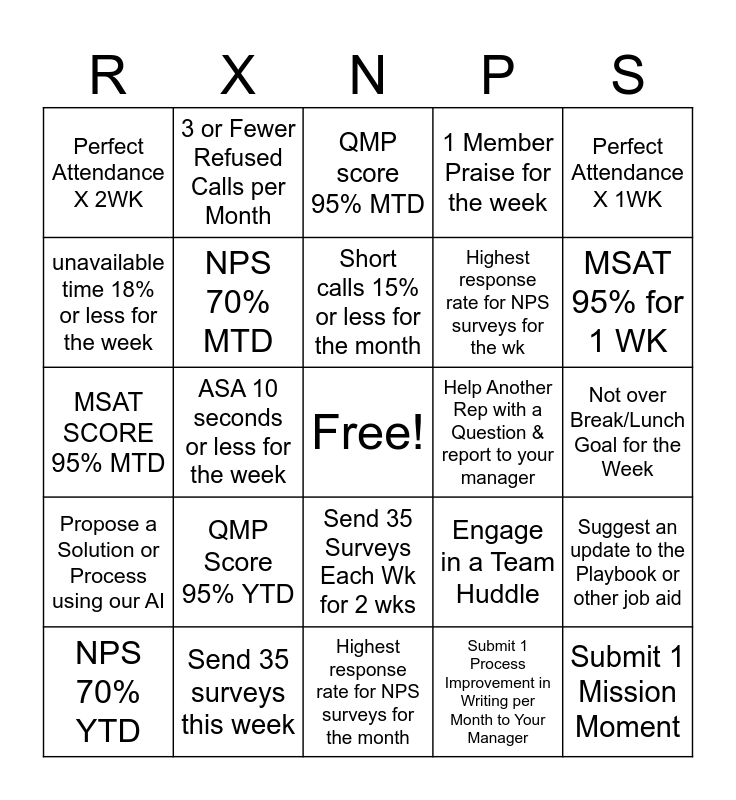 This bingo card has a free space and 24 words: QMP Score 95% YTD, Send 35 surveys this week, Short calls 15% or less for the month, NPS 70% YTD, Perfect Attendance X 1WK, Perfect Attendance X 2WK, unavailable time 18% or less for the week, 3 or Fewer Refused Calls per Month, Help Another Rep with a Question & report to your manager, Send 35 Surveys Each Wk for 2 wks, Highest response rate for NPS surveys for the wk, MSAT SCORE 95% MTD, Engage in a Team Huddle, Suggest an update to the Playbook or other job aid, NPS 70% MTD, Submit 1 Process Improvement in Writing per Month to Your Manager, Not over Break/Lunch Goal for the Week, QMP score 95% MTD, MSAT 95% for 1 WK, ASA 10 seconds or less for the week, Submit 1 Mission Moment, Propose a Solution or Process using our AI, 1 Member Praise for the week and Highest response rate for NPS surveys for the month.