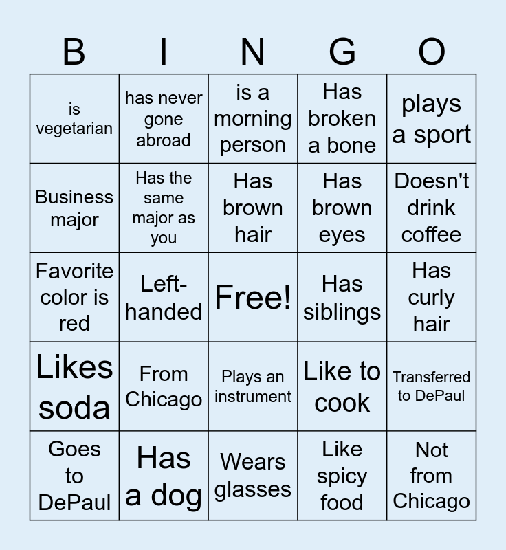 This bingo card has a free space and 24 words: Goes to DePaul, From Chicago, Has brown hair, Like spicy food, plays a sport, is vegetarian, has never gone abroad, is a morning person, Has siblings, Has curly hair, Favorite color is red, Has the same major as you, Like to cook, Transferred to DePaul, Business major, Has a dog, Wears glasses, Has broken a bone, Doesn't drink coffee, Likes soda, Left-handed, Plays an instrument, Has brown eyes and Not from Chicago.