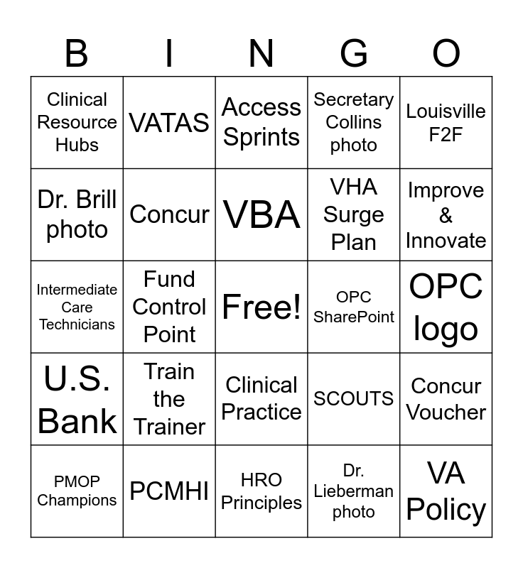This bingo card has a free space and 56 words: PACT Act, PMOP Champions, PCPLDP, Clinical Resource Hubs, HRO Principles, High-Risk Patients, Concur, VATAS, VHA Surge Plan, PIM-RIVET, Secretary Collins photo, PACT To The Future, PDICI, GovTA, Travel Card, TMS, Louisville F2F, Fund Control Point, Dr. Scavella photo, VA Policy, OPC SharePoint, Executive Leadership Team, SCOUTS, Access Sprints, Cerner, VBA, PT PACT, Angela Denietolis photo, Improve & Innovate, Telework, Toxic Exposure Screening, USH, PACT Fidelity Model, PC Operations, OPC logo, Dr. Brill photo, Intermediate Care Technicians, Team Building, U.S. Bank, VATAS, Clinical Practice, Travel Per Diem, Clinical Services (11), EHRM, AUSH, Train the Trainer, PCMHI, Business Operations & Management, Primary Care Sub-councils, PACT Teams, Dr. Lieberman photo, KUDOS!, G-Invoicing, Business Guidelines, Concur Voucher and Government Purchase Card.