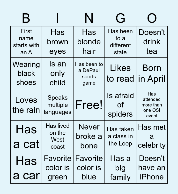 This bingo card has a free space and 24 words: Has lived on the West coast, Favorite color is green, Has been to a DePaul sports game, Has a car, Doesn't drink tea, First name starts with an A, Wearing black shoes, Has brown eyes, Is afraid of spiders, Never broke a bone, Likes to read, Loves the rain, Has taken a class in the Loop, Has met a celebrity, Is an only child, Has a big family, Has attended more than one OSI event, Has blonde hair, Born in April, Speaks multiple languages, Doesn't have an iPhone, Has a cat, Has been to a different state and Favorite color is blue.
