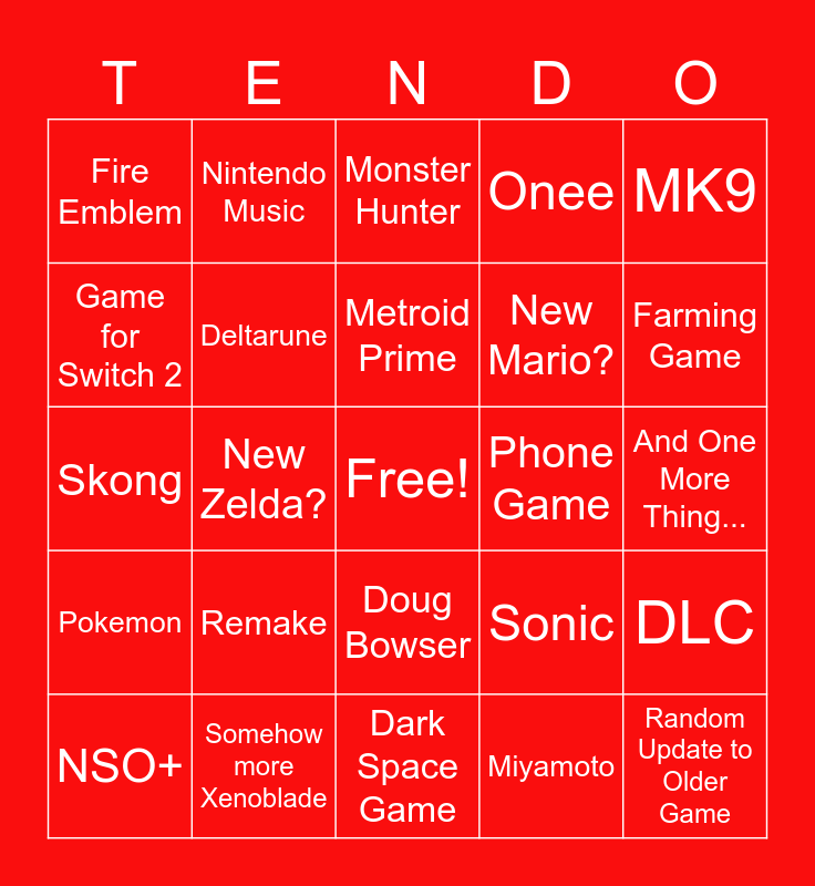 This bingo card has a free space and 24 words: Remake, Somehow more Xenoblade, Metroid Prime, NSO+, MK9, Fire Emblem, Game for Switch 2, Nintendo Music, Phone Game, Doug Bowser, New Mario?, Skong, Sonic, DLC, Deltarune, Miyamoto, And One More Thing..., Monster Hunter, Farming Game, New Zelda?, Random Update to Older Game, Pokemon, Onee and Dark Space Game.