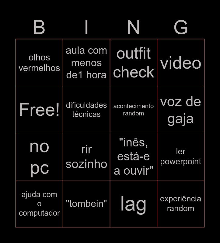 This bingo card has 16 words: "tombein", ler powerpoint, outfit check, olhos vermelhos, no pc, aula com menos de1 hora, "inês, está-e a ouvir", lag, Free!, dificuldades técnicas, ajuda com o computador, video, rir sozinho, voz de gaja, acontecimento random and experiência random.