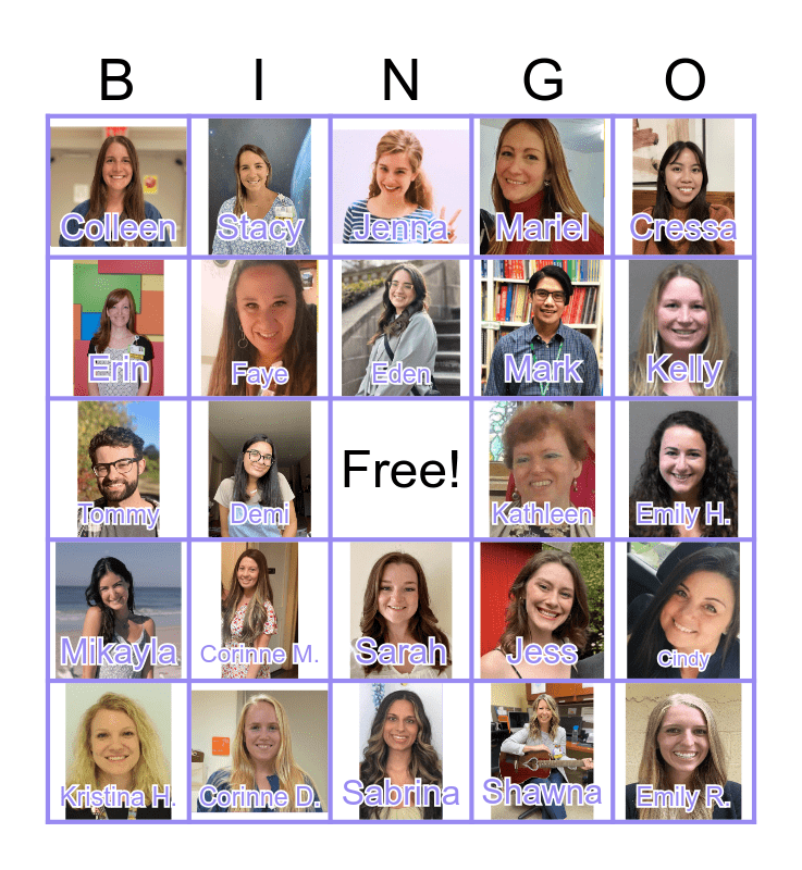 This bingo card has 38 images, a free space and 38 words: Amanda, Christina G., Becca M., Faye, Cindy, Corinne M., Eden, Stephanie, Cressa, Mark, Demi, Mariel, Emily R., Emily H., Erin, Mikayla, Gabbi, Jenna, Daniela, Kathleen, Colleen, Corinne D., Kelly, Kristina H., Lauren, Sabrina, Meg B., Meg L., Sophie, Rebecca V., Sammy, Sarah, Shawna, Stacy, Marianne, Jess, Tommy and Therese.