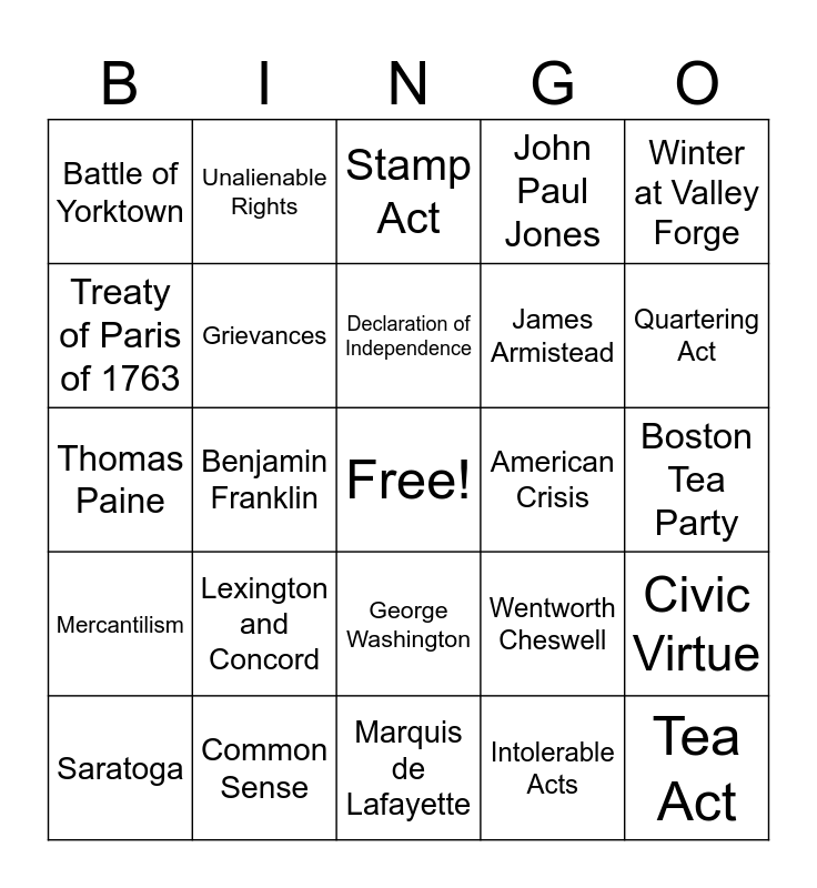 This bingo card has a free space and 24 words: Lexington and Concord, Common Sense, Declaration of Independence, Saratoga, Winter at Valley Forge, Battle of Yorktown, Treaty of Paris of 1763, Unalienable Rights, American Crisis, George Washington, James Armistead, Thomas Paine, Wentworth Cheswell, Civic Virtue, Grievances, Intolerable Acts, Boston Tea Party, Stamp Act, Quartering Act, Benjamin Franklin, Tea Act, Mercantilism, John Paul Jones and Marquis de Lafayette.