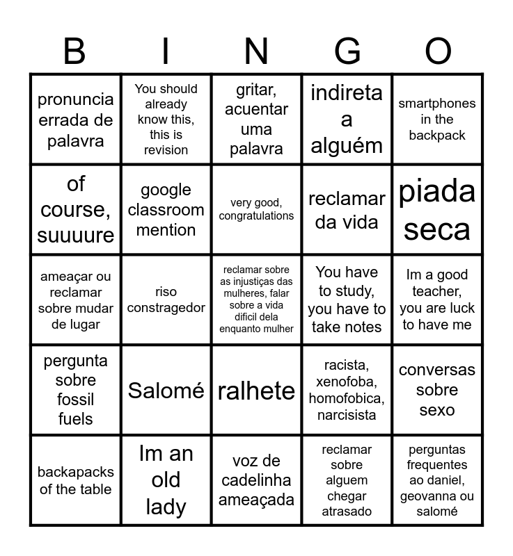 This bingo card has 25 words: Salomé, voz de cadelinha ameaçada, very good, congratulations, backapacks of the table, smartphones in the backpack, pronuncia errada de palavra, of course, suuuure, You should already know this, this is revision, You have to study, you have to take notes, ralhete, reclamar da vida, ameaçar ou reclamar sobre mudar de lugar, racista, xenofoba, homofobica, narcisista, conversas sobre sexo, google classroom mention, perguntas frequentes ao daniel, geovanna ou salomé, Im a good teacher, you are luck to have me, gritar, acuentar uma palavra, piada seca, riso constragedor, reclamar sobre as injustiças das mulheres, falar sobre a vida dificil dela enquanto mulher, Im an old lady, pergunta sobre fossil fuels, indireta a alguém and reclamar sobre alguem chegar atrasado.
