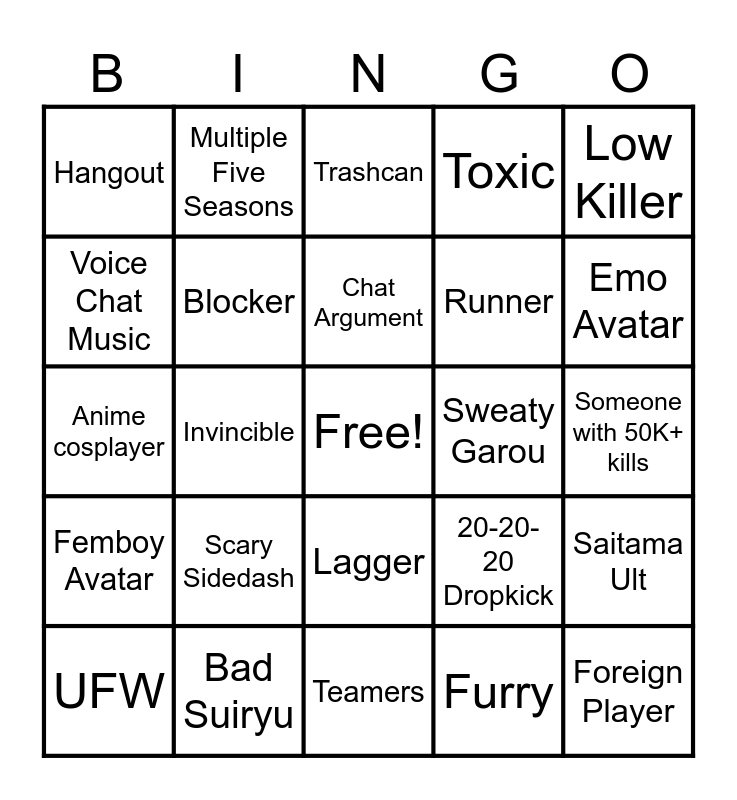 This bingo card has a free space and 24 words: UFW, Scary Sidedash, Chat Argument, Furry, Low Killer, Hangout, Multiple Five Seasons, Trashcan, Sweaty Garou, Someone with 50K+ kills, Anime cosplayer, Blocker, 20-20-20 Dropkick, Saitama Ult, Voice Chat Music, Bad Suiryu, Teamers, Toxic, Emo Avatar, Femboy Avatar, Invincible, Lagger, Runner and Foreign Player.