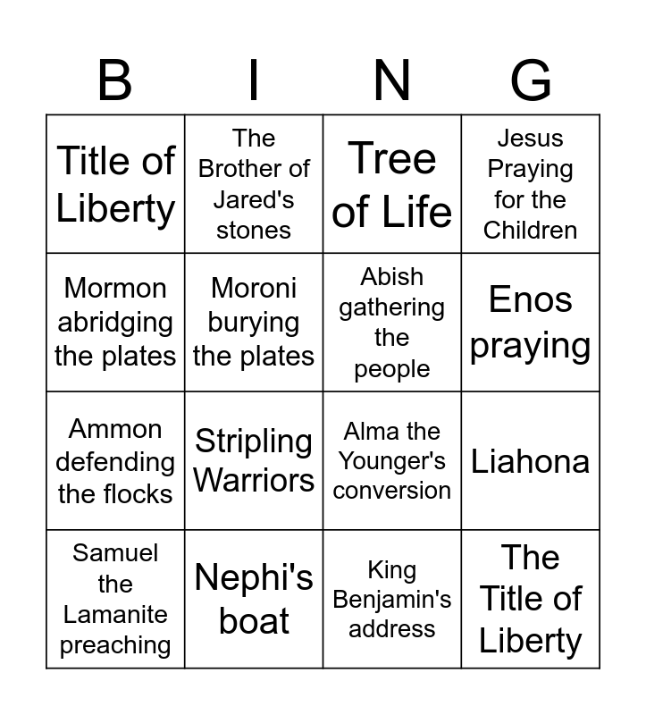 This bingo card has 16 words: Nephi's boat, Liahona, Tree of Life, Title of Liberty, Ammon defending the flocks, The Brother of Jared's stones, Alma the Younger's conversion, King Benjamin's address, Mormon abridging the plates, Moroni burying the plates, Samuel the Lamanite preaching, Jesus Praying for the Children, Stripling Warriors, Enos praying, Abish gathering the people and The Title of Liberty.