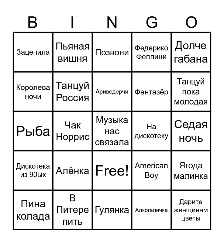 This bingo card has 26 words: Free!, Алкогаличка, Ариведерчи, В Питере пить, Долче габана, Зацепила, Королева ночи, Пьяная вишня, Седая ночь, American Boy, Фантазёр, Рыба, Ягода малинка, Пина колада, Чак Норрис, Я не дам, Федерико Феллини, Дискотека из 90ых, Позвони, Музыка нас связала, Танцуй пока молодая, Гулянка, На дискотеку, Алёнка, Танцуй Россия and Дарите женщинам цветы.