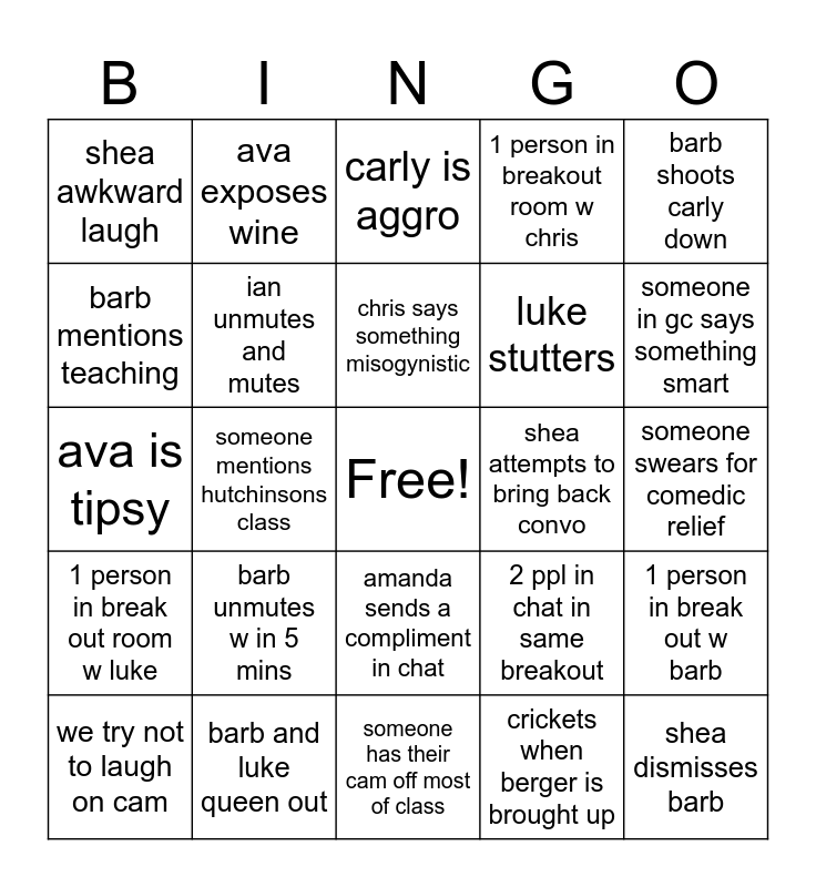 This bingo card has a free space and 24 words: barb unmutes w in 5 mins, barb and luke queen out, chris says something misogynistic, we try not to laugh on cam, barb shoots carly down, shea awkward laugh, barb mentions teaching, ava exposes wine, shea attempts to bring back convo, amanda sends a compliment in chat, luke stutters, ava is tipsy, 2 ppl in chat in same breakout, 1 person in break out w barb, ian unmutes and mutes, crickets when berger is brought up, someone swears for comedic relief, carly is aggro, someone in gc says something smart, someone mentions hutchinsons class, shea dismisses barb, 1 person in break out room w luke, 1 person in breakout room w chris and someone has their cam off most of class.