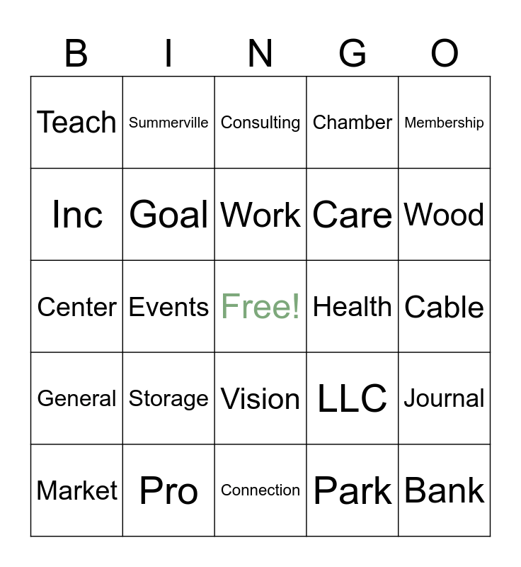 This bingo card has a free space and 29 words: Market, Physical Therapy, Events, Studio, Teach, Consulting, Goal, Storage, Health, Pro, Cable, Bank, Connection, Park, Wood, Fitness, Vision, General, Membership, Center, LLC, Home, Care, Inc, Chamber, Summerville, Journal, Work and America.
