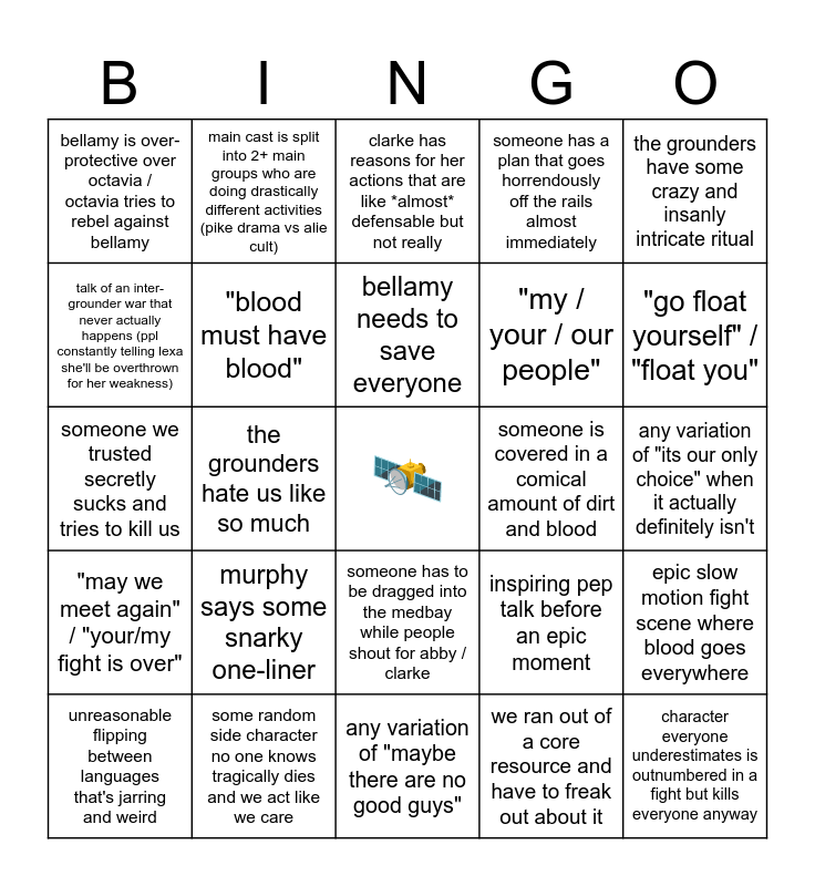 This bingo card has a free space and 33 words: murphy gets kidnapped / tortured, jaha preaches / thinks hes the chosen one, the grounders hate us like so much, crazy out of place reference to really early show events (finns death, wells death, murphy hanging), "may we meet again" / "your/my fight is over", "blood must have blood", the grounders have some crazy and insanly intricate ritual, unreasonable flipping between languages that's jarring and weird, main cast is split into 2+ main groups who are doing drastically different activities (pike drama vs alie cult), deux ex montys hacking skills, bellamy needs to save everyone, clarke has reasons for her actions that are like *almost* defensable but not really, one specific character gets really emotional and does something that puts everyone else in grave danger, unnecessary lovey scene, someone is covered in a comical amount of dirt and blood, "go float yourself" / "float you", some random side character no one knows tragically dies and we act like we care, someone we trusted secretly sucks and tries to kill us, murphy says some snarky one-liner, inspiring pep talk before an epic moment, someone has to be dragged into the medbay while people shout for abby / clarke, nameless guards really wanna kill people, bellamy is over-protective over octavia / octavia tries to rebel against bellamy, any variation of "its our only choice" when it actually definitely isn't, any variation of "maybe there are no good guys", character everyone underestimates is outnumbered in a fight but kills everyone anyway, someone has a plan that goes horrendously off the rails almost immediately, "my / your / our people", talk of an inter-grounder war that never actually happens (ppl constantly telling lexa she'll be overthrown for her weakness), epic slow motion fight scene where blood goes everywhere, our people are divided and start fighting each other (kane vs pike), we ran out of a core resource and have to freak out about it and everything stops so we can dramatically stare into the distance / at each other before the scene cuts away.
