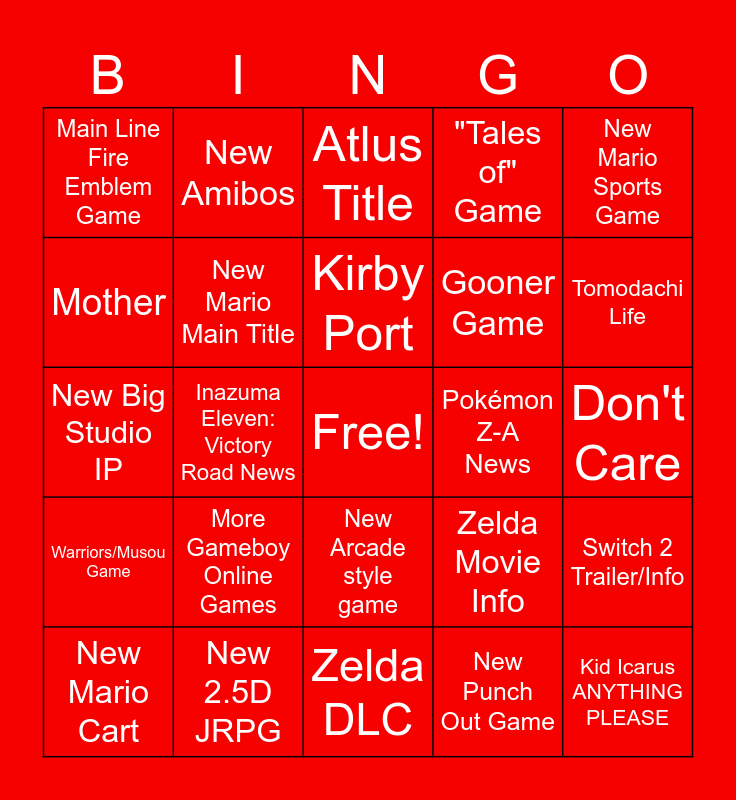 This bingo card has a free space and 24 words: More Gameboy Online Games, New 2.5D JRPG, Kirby Port, New Mario Cart, New Mario Sports Game, Main Line Fire Emblem Game, Mother, New Amibos, Pokémon Z-A News, New Arcade style game, Gooner Game, New Big Studio IP, Zelda Movie Info, Switch 2 Trailer/Info, New Mario Main Title, New Punch Out Game, Don't Care, Atlus Title, Tomodachi Life, Inazuma Eleven: Victory Road News, Kid Icarus ANYTHING PLEASE, Warriors/Musou Game, "Tales of" Game and Zelda DLC.