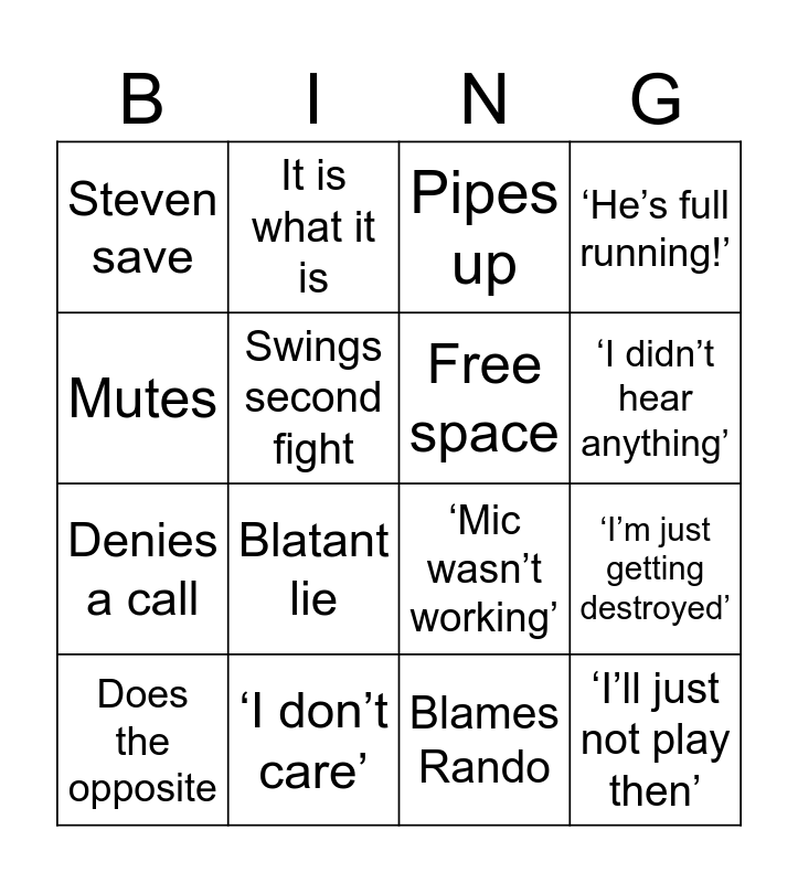 This bingo card has 16 words: ‘I don’t care’, ‘I’m just getting destroyed’, Pipes up, Steven save, Denies a call, It is what it is, ‘Mic wasn’t working’, Blames Rando, Mutes, Swings second fight, Does the opposite, ‘He’s full running!’, Blatant lie, ‘I didn’t hear anything’, Free space and ‘I’ll just not play then’.