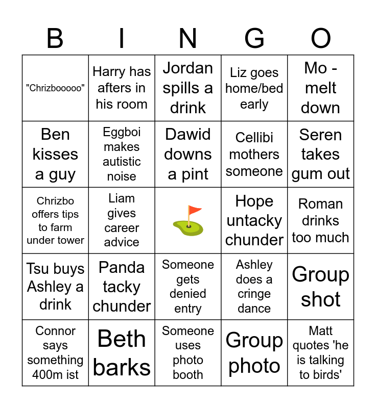 This bingo card has a free space and 24 words: Panda tacky chunder, Beth barks, Dawid downs a pint, Connor says something 400m ist, Mo - melt down, "Chrizbooooo", Ben kisses a guy, Harry has afters in his room, Hope untacky chunder, Someone gets denied entry, Cellibi mothers someone, Chrizbo offers tips to farm under tower, Ashley does a cringe dance, Group shot, Eggboi makes autistic noise, Group photo, Roman drinks too much, Jordan spills a drink, Seren takes gum out, Liam gives career advice, Matt quotes 'he is talking to birds', Tsu buys Ashley a drink, Liz goes home/bed early and Someone uses photo booth.