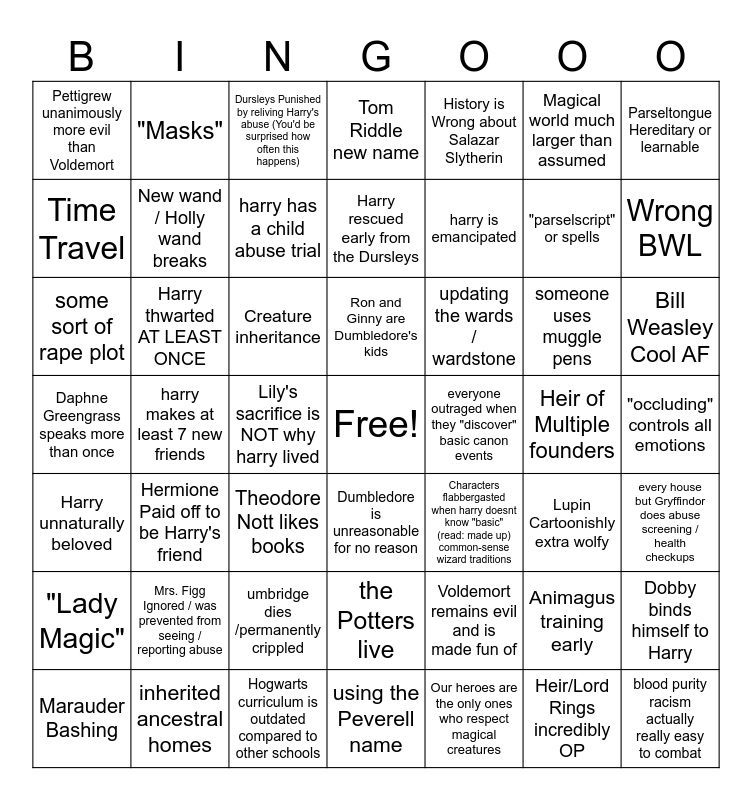 This bingo card has a free space and 78 words: Custody Battle / Exchange, Mrs. Figg Ignored / was prevented from seeing / reporting abuse, Dursleys Punished by reliving Harry's abuse (You'd be surprised how often this happens), Animagus training early, Characters have random new important relatives, Different house, every house but Gryffindor does abuse screening / health checkups, Only Ginny and Molly evil, Lupin Cartoonishly extra wolfy, Marauder Bashing, Heir of Multiple founders, Tom resurrected / put back together, Tom Riddle new name, Pettigrew unanimously more evil than Voldemort, "neutral faction", Magical world much larger than assumed, Hermione Paid off to be Harry's friend, Creature inheritance, Laws either impossibly complicated or ridiculously nonexistent, some sort of rape plot, Characters flabbergasted when harry doesnt know "basic" (read: made up) common-sense wizard traditions, History is Wrong about Salazar Slytherin, Harry rescued early from the Dursleys, Time Travel, Parseltongue Hereditary or learnable, Our heroes are the only ones who respect magical creatures, inherited ancestral homes, using the Peverell name, blood adoption, Snape / either lupin or sirius, harry has a child abuse trial, inter house unity, harry makes at least 7 new friends, blood purity racism actually really easy to combat, Bill Weasley Cool AF, Wrong BWL, Ron is a strategy god, Narcissa Clears Lucius, Dumbledore is unreasonable for no reason, "parselscript" or spells, everyone outraged when they "discover" basic canon events, Voldemort remains evil and is made fun of, Dumbledore is as big as or bigger problem than voldemort, Wizengamot members are all upstanding, just misled, Theodore Nott likes books, "Masks", "occluding" controls all emotions, Harry unnaturally beloved, Harry has a ponytail, time travel at the last killing curse, someone uses muggle pens, harry is emancipated, updating the wards / wardstone, "goblin friend", unclear Dumbledore motivations "sad old man", panic attack over a dead character, "Lady Magic", The Potters are terrible parents, Heir/Lord Rings incredibly OP, Ron and Ginny are Dumbledore's kids, New wand / Holly wand breaks, Apparition laughably OP, Harry goes on the run pre-hogwarts or during the summer, Remus or Sirius Bashing, Harry has dignified house elves, Harry is an unreasonably competent political Powerhouse, Hagrid stupidity, ENHANCE, umbridge dies /permanently crippled, Harry thwarted AT LEAST ONCE, Daphne Greengrass speaks more than once, muggle tech working with magic, Hogwarts curriculum is outdated compared to other schools, the Potters live, Harry uses unforgivables, Lily's sacrifice is NOT why harry lived, "grandfatherly" is used for Dumbledore (neg/pos), Dobby binds himself to Harry and Dark / Grey harry.