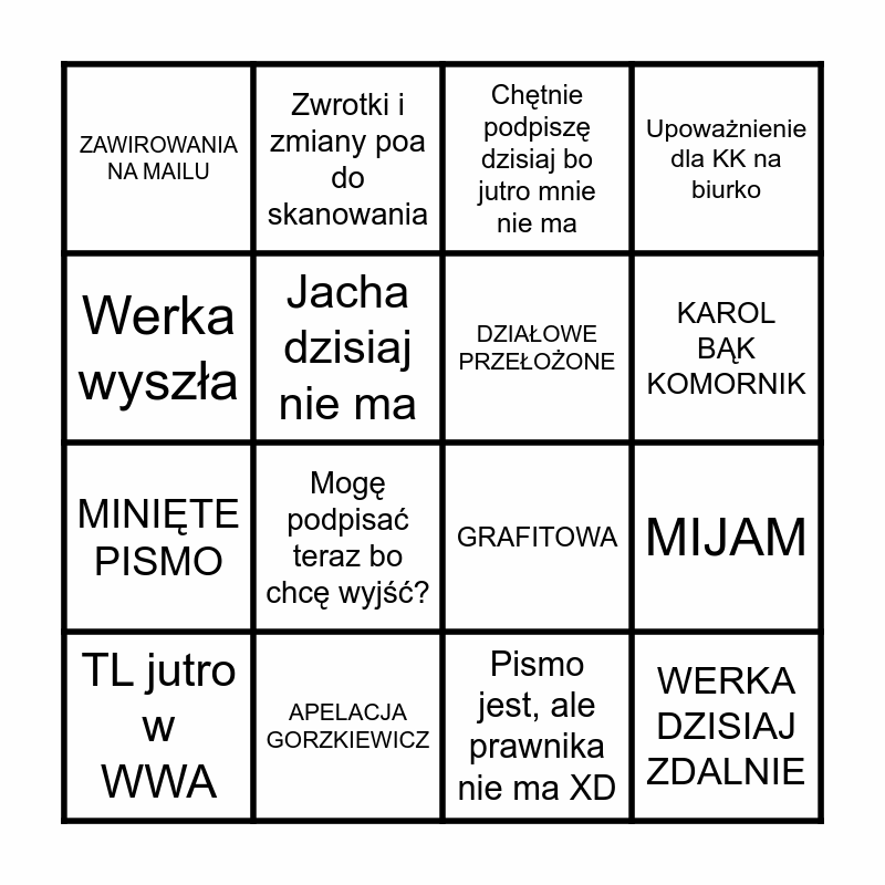 This bingo card has 16 words: TL jutro w WWA, APELACJA GORZKIEWICZ, Chętnie podpiszę dzisiaj bo jutro mnie nie ma, Upoważnienie dla KK na biurko, Werka wyszła, Zwrotki i zmiany poa do skanowania, GRAFITOWA, MIJAM, ZAWIROWANIA NA MAILU, Jacha dzisiaj nie ma, Pismo jest, ale prawnika nie ma XD, KAROL BĄK KOMORNIK, MINIĘTE PISMO, Mogę podpisać teraz bo chcę wyjść?, DZIAŁOWE PRZEŁOŻONE and WERKA DZISIAJ ZDALNIE.