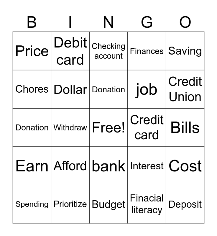 This bingo card has a free space and 25 words: Afford, Budget, Donation, Spending, Saving, Price, Chores, Debit card, Credit card, bank, job, Donation, Interest, Cost, Dollar, Coins, Bills, Checking account, Credit Union, Withdraw, Deposit, Prioritize, Earn, Finances and Finacial literacy.